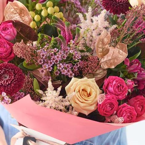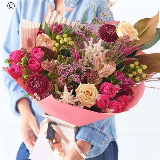 A beautiful bouquet handcrafted by their local florist featuring blooms in cerise and purple tones, with soft pink, peach or lilac shades. It might also feature dried flowers or foliage painted in copper or rose gold.