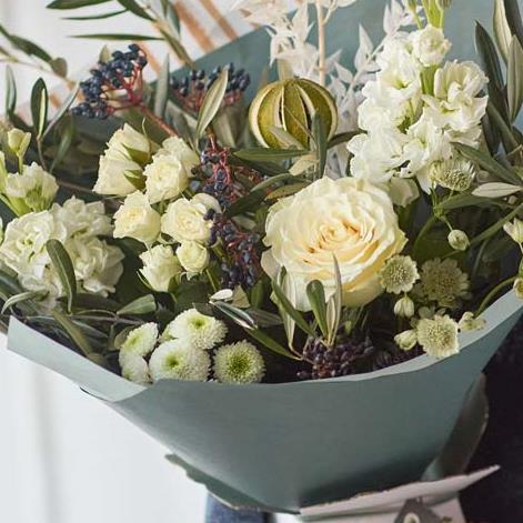 A striking bouquet of fresh and dried flowers in crisp, clean colours, chosen and arranged by the florist.